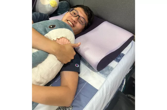 在陳小姐在讓我試到這顆紫色的人體工學頸椎枕,我立馬就睡著了(笑),是立即就感受到頸椎壓力完全釋放;枕頭設計的凹槽除了有支撐的效果外,從側邊觀察身體與頸椎的線條也非常平順。此外,還有Powersleep專利設計的墊片,讓我在側睡時也能安然入睡,更讓我相信我找到對的枕頭了。